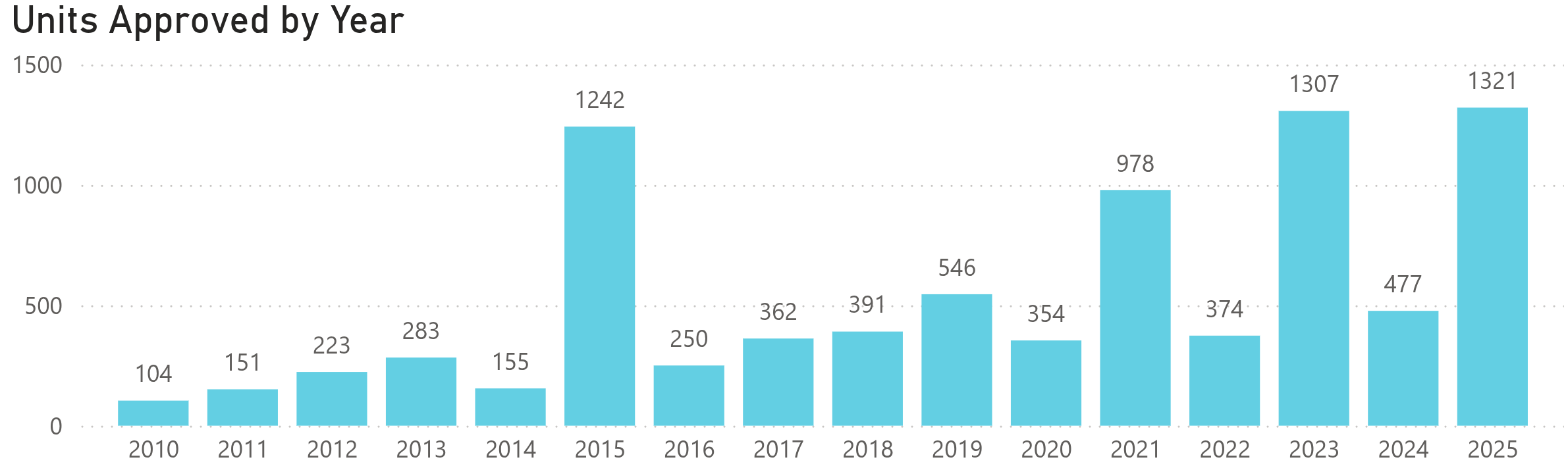 Note: our graph has an additional 73 units approved in 2025 because at time of writing Old Port Square Tower is not yet in the City Housing Dashboard.